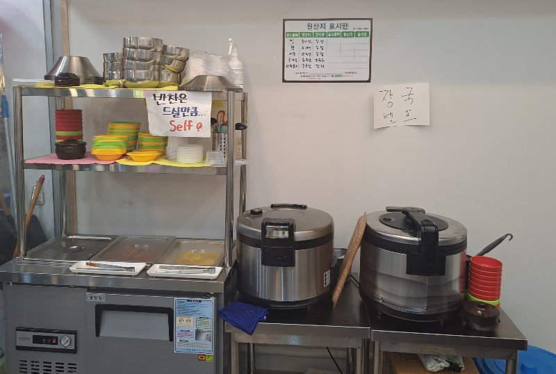 셀프바에는 단무지와 김치와 장국이 있습니다.