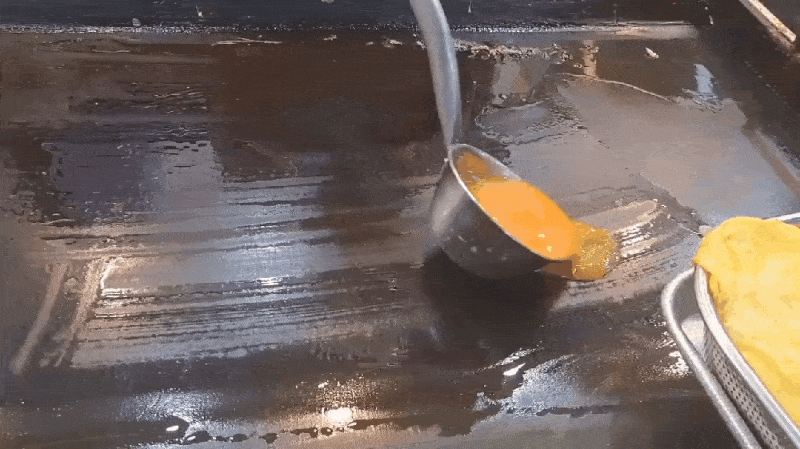 계란을 큰 철판에 얇게 쫘악 펴서 그 안에 김밥을 넣어서 돌돌 말아서 만들어 주십니다.