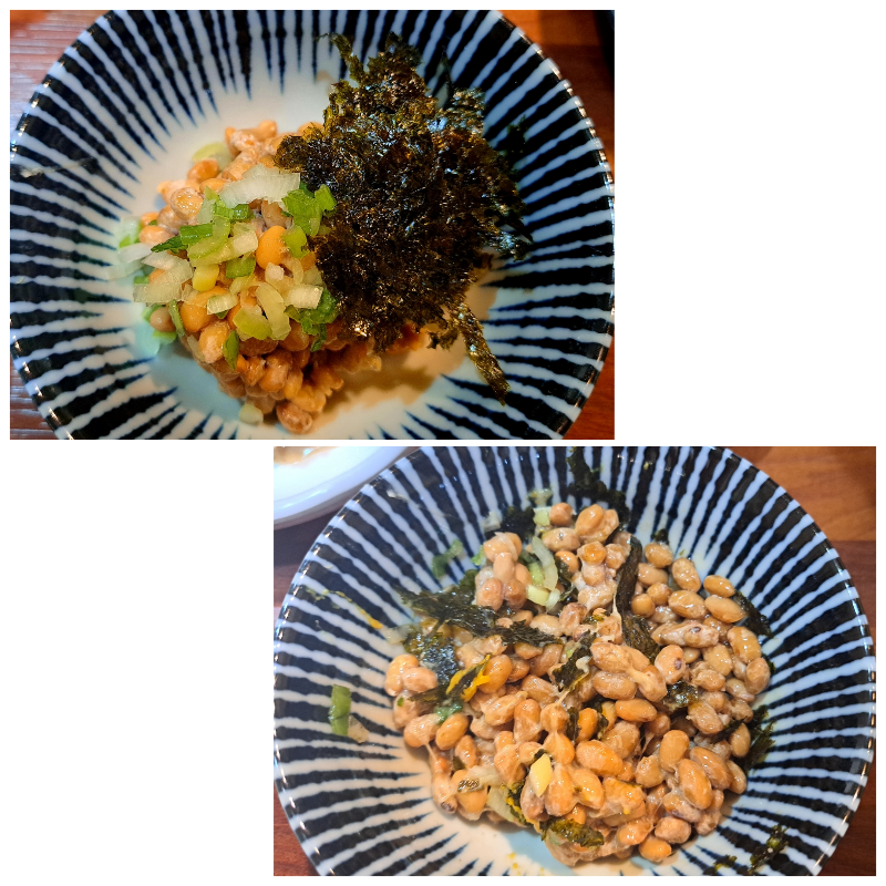 낫또 한 접시는 구운김가루,겨자,다진파와 함께 나옵니다.