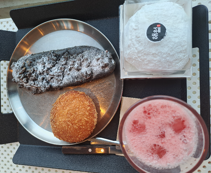 시그니처 빵인 해월빵과 언양불고기 고로케, 까망크렌치 빵 세 개와 음료는 수박주스로 주문했습니다.