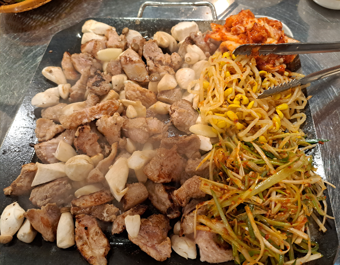 큰 고깃덩어리들을 잘라서 구워주시고 버섯, 콩나물, 김치, 파채와 함께 세팅을 다 해주십니다.