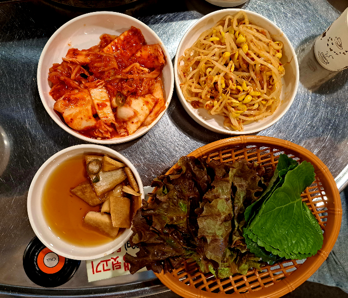 상추와 깻잎과 고기와 함께 구워 먹을 콩나물과 김치가 나옵니다.