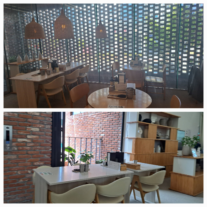 건물한면이 벽돌을 교차해서 만들어 자연채광이 넘 이뿌게 들어오는 통창도 있고 조명들도 따뜻한 인테리어였습니다.