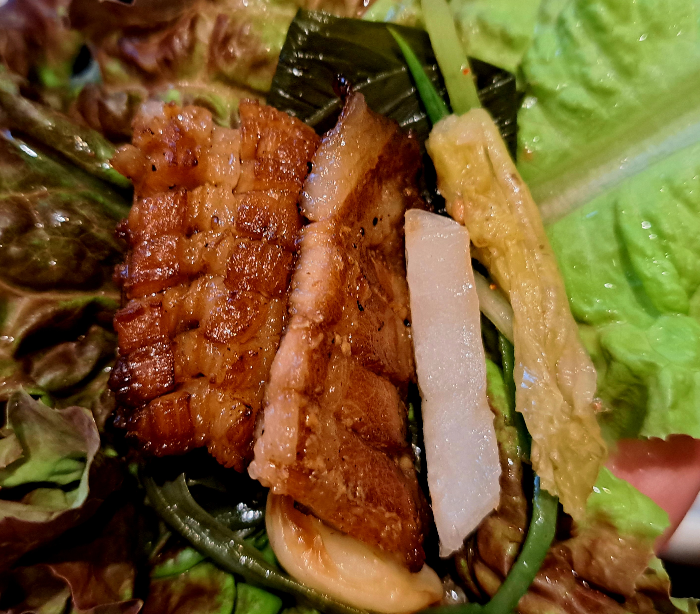 양파, 고추, 마늘, 버섯, 감자, 김치, 파인애플, 브로콜리, 방울토마토가 돼지갈비와 함께 구워져 나오니 스테이크를 먹는 기분도 든답니다.