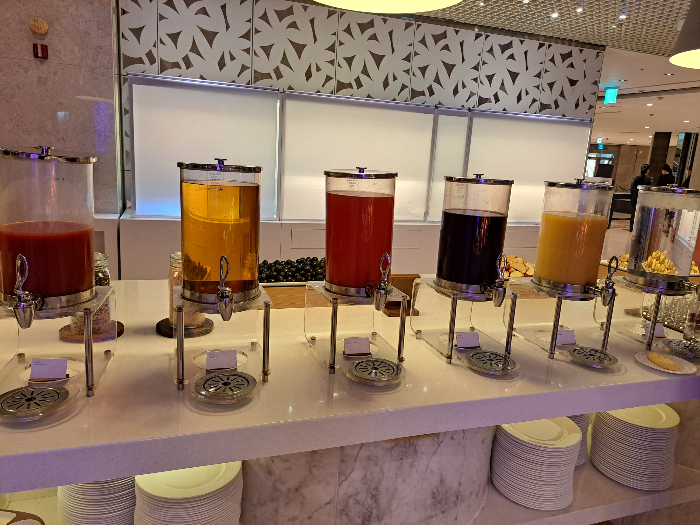 음료 코너에는 토마토, 사과, 오렌지, 자몽 등등 다양한 주스들도 있습니다.