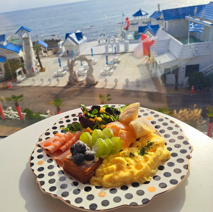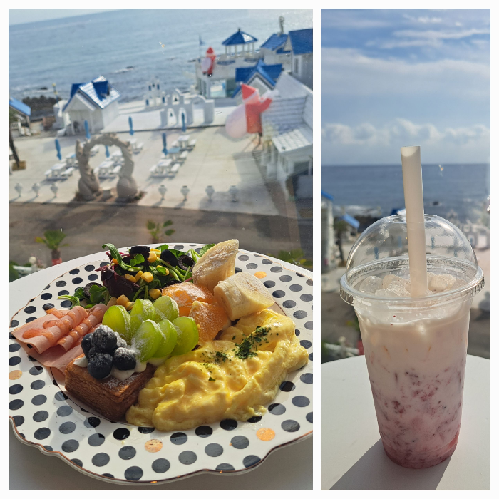푸짐하고 다양한 구성의 브런치를 산토리니 풍경과 뻥 뚫린 바다 뷰를 함께 보며 즐길 수 있는 이국적인 카페였습니다.