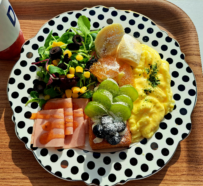 스크램블, 슬라이스 햄 , 신선한 과일, 빵, 샐러드 등이 어우러진 브런치인데요.