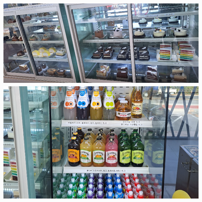 쑈케이스 안에는 여러 가지 케이크들과 맥주, 아이들을 위한 뽀로로 음료도 판매 중입니다.